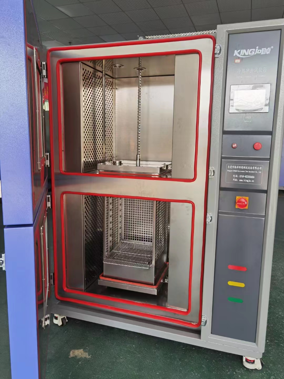 兩箱式冷熱沖擊試驗箱在高低溫室內切換轉移,采用吊籃移動式控制,轉換時間短符合國標要求,溫度恢復時間短,溫變速度快,設備整體結構緊湊,體積小,采用兩箱法,提高了工作室的溫度均勻性。