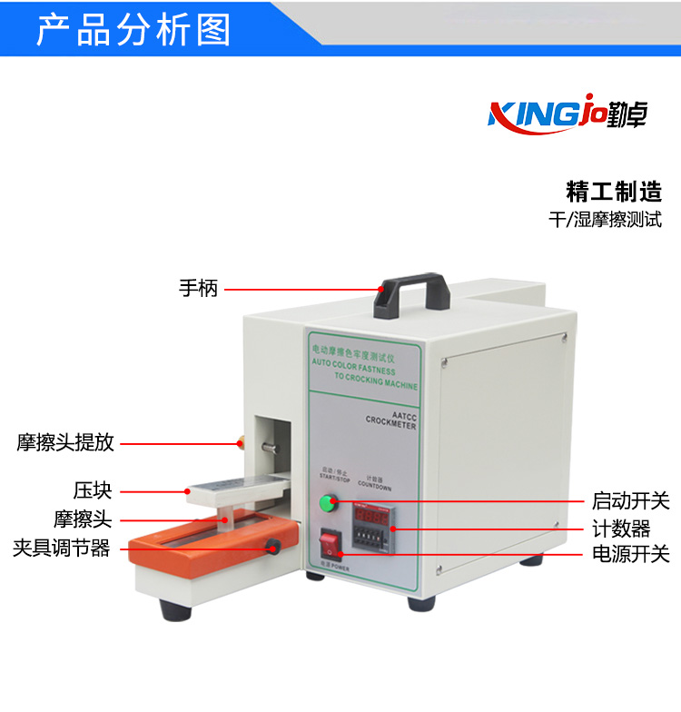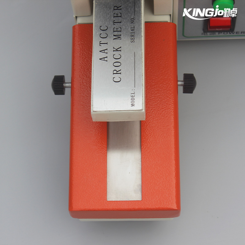 本儀器為整體式設(shè)計,主要由底座、摩擦傳動機構(gòu)和計數(shù)器組成,用試樣夾將試樣和砂紙固定在底座的一側(cè),搖動手柄使裝有白棉布的摩擦頭在試樣上作規(guī)定行程的往復(fù)運動,使白棉布和試樣相互摩擦,摩擦十次后觀察并用灰卡對比評定白棉布上的粘色程度,對織物試樣的染色或表面涂層的穩(wěn)定性作出評判,為材料的評估和選擇提供參考數(shù)據(jù)。本儀器適用于紗線、色織、印染等紡織品以及玩具產(chǎn)品上或其內(nèi)部的所有織物。